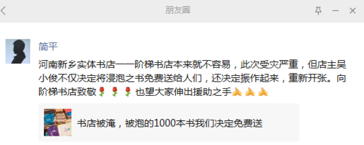 得知消息之后,上海作家简平老师迅速通过朋友圈转发了阶梯书店的自救计划,并得到了不少文化界同仁的点赞响应。简平老师在接受记者采访时表示:“实体书店本来就不容易,此次受灾严重,但店主吴小俊不仅决定将浸泡之书免费送给人们,还决定振作起来,重新开张。向阶梯书店致敬,也望大家伸出援助之手!”