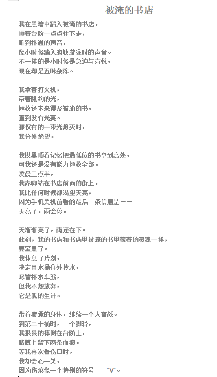 而接下来的十几个小时是非常煎熬的,不到午夜12点,书店的另一个房间也进水了,吴小俊知道,这下书店图书的损失至少扩大了20倍。他用半诗体文字记录下了那些时候的心情: