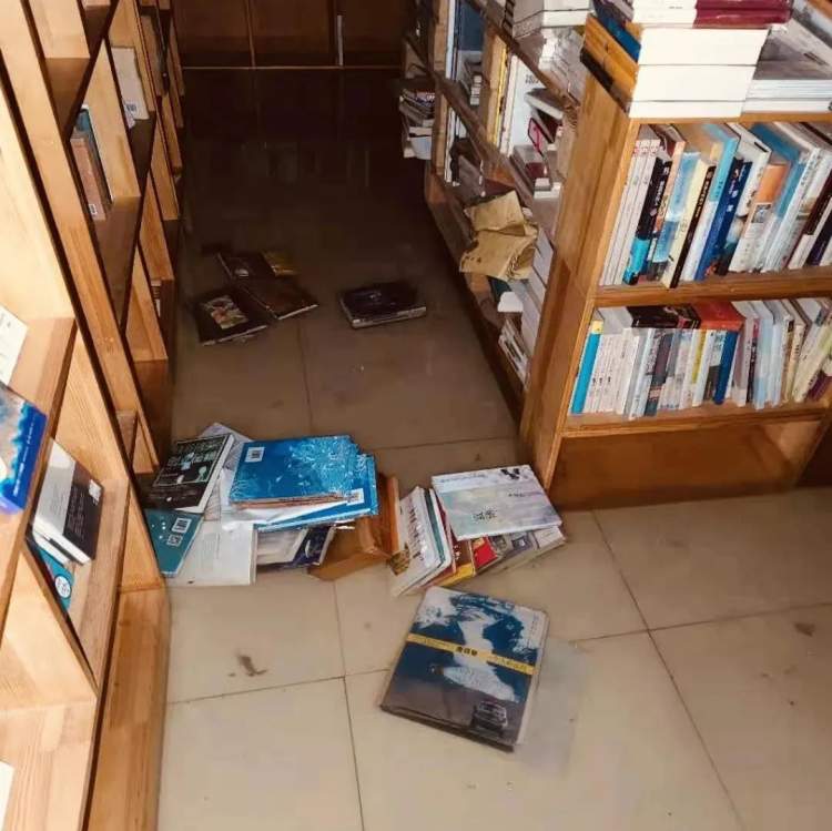 7月21日晚上大约8点钟,雨瞬间下大了,书店内瞬间又有了积水,下的最大时,我看着咕咕的水往店里流,水流太快,我无助的看水往里流,抽水机的抽水速度赶不上进水的速度,几十分钟后,更让人崩溃的事情发生了,停电了,外边下的更大了,还电闪雷鸣,我在黑暗中听着水声不断往书店里流。