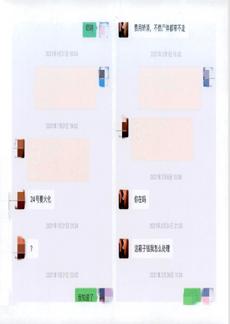 11月2日,“医院护士小露”用姜某的微信联系小文,称“姜某”在杭州住院,小文赶紧转账支付了住院费、医药费。2021年1月19日,“小露”说“姜某”因肾移植去世了,但是到了1月30日,“小露”又说“姜某”没死是误会。两天后,“小露”告诉小文,“姜某”还是死了,向小文索要尸体清洗费,小文感觉被骗了,便报了警。