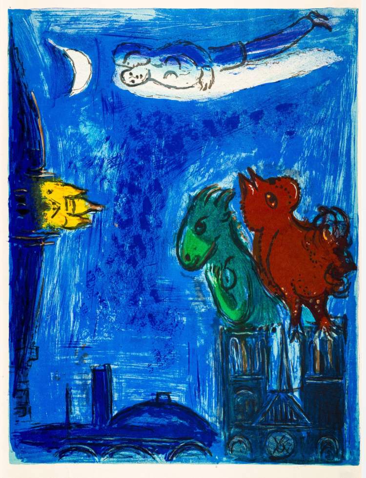 ■巴黎圣母院的怪物,石板印刷 The Monsters of Notre-Dame,Lithography, 28x38cm,1954Marc Chagall, The Monsters of Notre-Dame , 1954,Lithographyⓒ Marc Chagall / ADAGP, Paris – SACK, Seoul, 2021