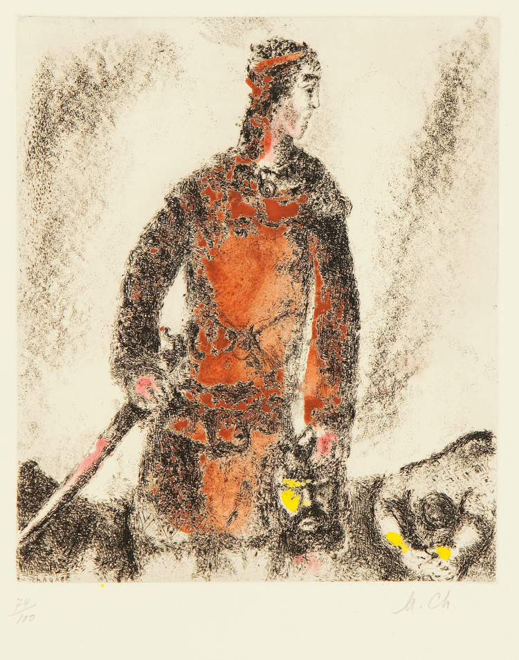 ■大卫战胜歌利亚《圣经》,手工彩色蚀刻 David's Victory over Goliath “Bible”,Hand colored etching, 30x23cm,1931-39-52-56-58Marc Chagall,David's Victory over Goliath,1931-39-52-56-58,Hand colored etchingⓒ Marc Chagall / ADAGP, Paris – SACK,Seoul,2021