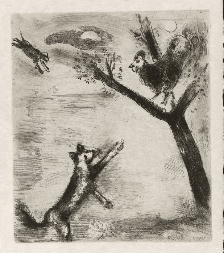 ■公鸡和狐狸《拉·封丹寓言》,(铜版画)蚀刻 The Rooster and the Fox,Etching 28.5×24.5cm,1927-30-52Marc Chagall,The Rooster and the Fox “Fables”,1927-30-52, Etchingⓒ Marc Chagall / ADAGP,Paris – SACK,Seoul,2021