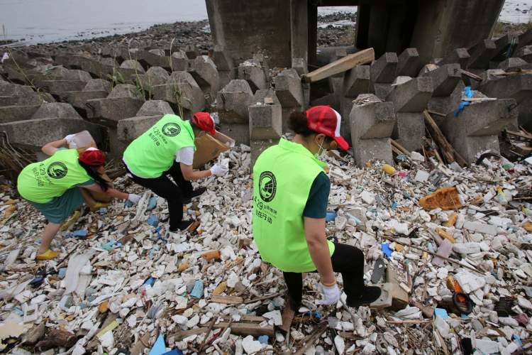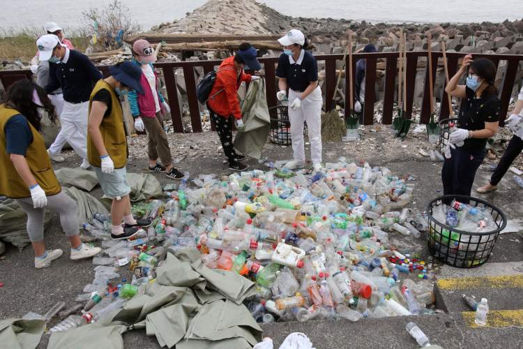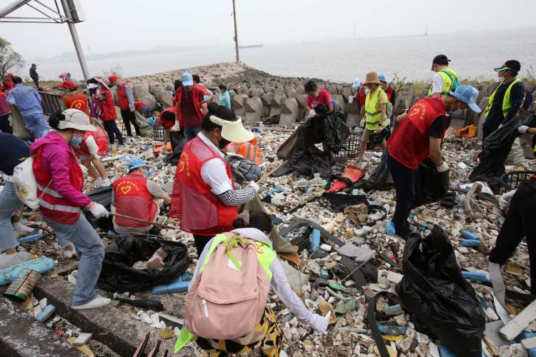 近下午5点,垃圾差不多清理干净,净滩行动告一段落,总共清理约15吨垃圾,包括29500多斤干垃圾和900多斤可回收物,装满了近1500个蛇皮袋。还有一部分垃圾在防浪堤的石缝中,极难清理,只能暂时让它们留在其中,随潮水回到海洋中或者冲上岸之后再清理。