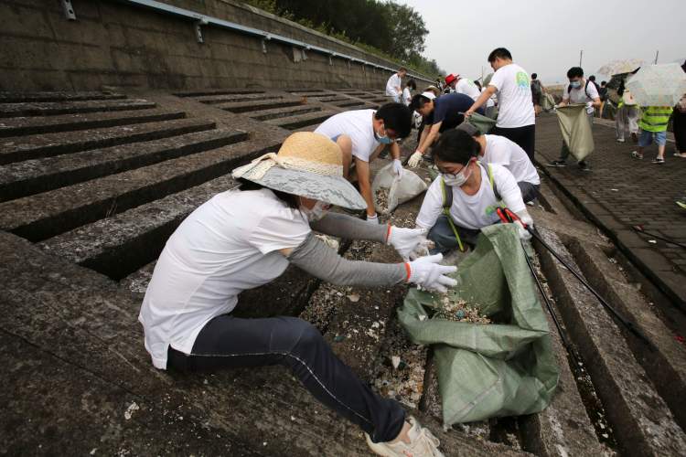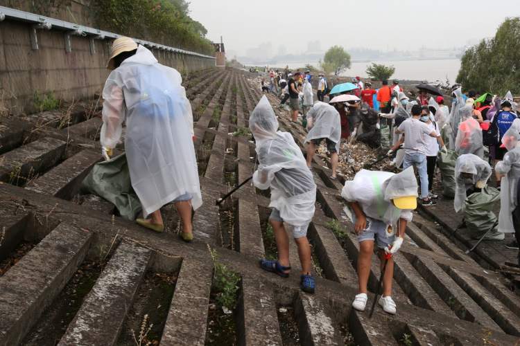 上午9点半至10点半之间,公园亲水平台、防浪堤附近捡拾垃圾的人数达到了高峰。这里有政府部门工作人员、有事业单位员工、有外企员工、有特警、有学生、有建筑公司员工,有环保机构成员、有户外运动爱好者团队……每一个人,不论身份、职业、年龄,都带着手套,拿着夹子、铲子和垃圾袋,在江边堤岸上努力捡拾着垃圾。