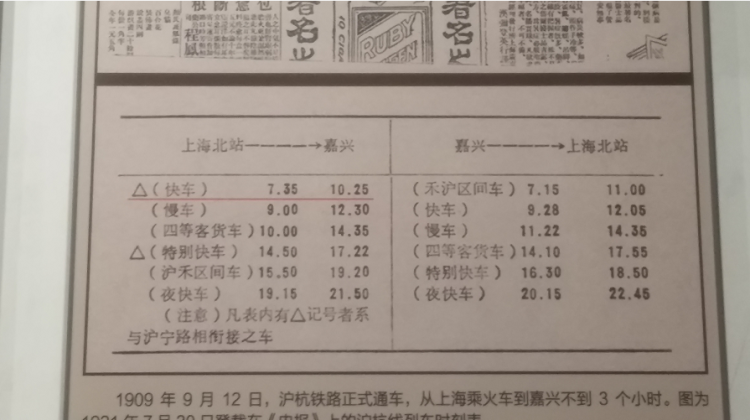 1921年7月30日《申报》刊发的沪杭线行车时刻表,红线标出了上海北站至嘉兴的快车时间