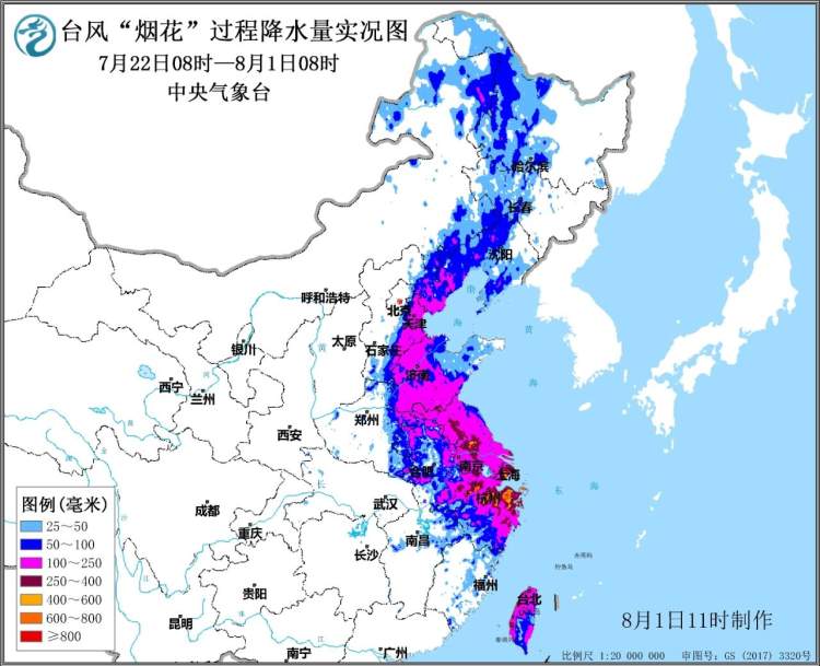 相对而言,“烟花”带来的降雨雨势比较平缓,最大小时降雨量10~30毫米。但由于降雨时间长,浙江、上海、江苏、安徽、山东等地累计雨量大。
