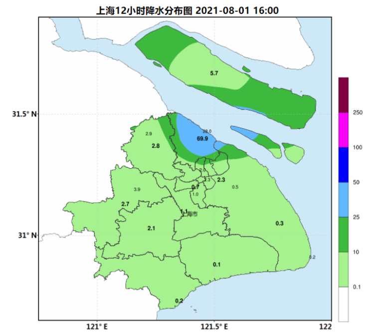 今天11时00分至17时30分降雨量,2个街镇超过50.0毫米,5.6%的街镇超过25.0毫米,24.7%的街镇超过10.0毫米。宝山区两小时内累积雨量60mm以上,达到暴雨级别;其中宝山杨行镇67.8毫米为最大,1小时雨量最大出现在宝山杨行镇67.5毫米。