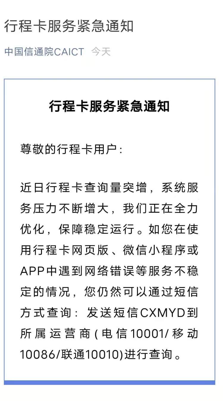 刚刚,中国信息通信研究院(以下简称中国信通院)发布紧急通知:近日行程卡查询量突增,系统服务压力不断增大,我们正在全力优化,保障稳定运行。如您在使用行程卡网页版、微信小程序或APP中遇到网络错误等服务不稳定的情况,您仍然可以通过短信方式查询:发送短信CXMYD到所属运营商(电信10001/移动10086/联通10010)进行查询。