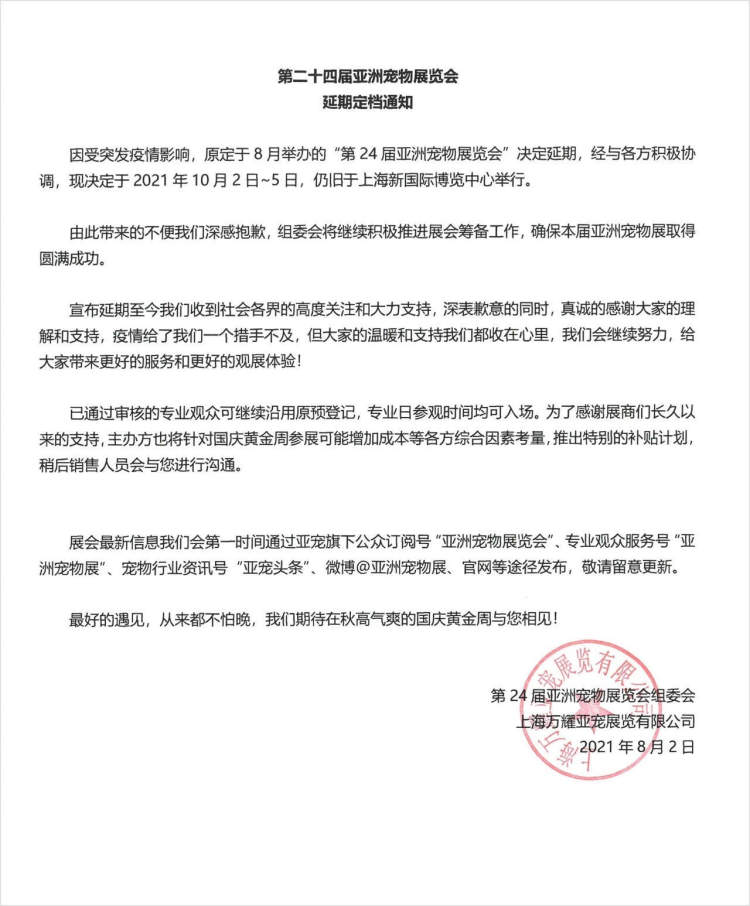 今天下午,周到君刚告诉大家第24届亚宠展因为疫情防控的原因要延期了(→详情点这里)。按照昨天发布的公告,具体时间将在15日左右公布。不得不说,这次组委会的速度还是挺快的,时隔一天就公布了最新定档。