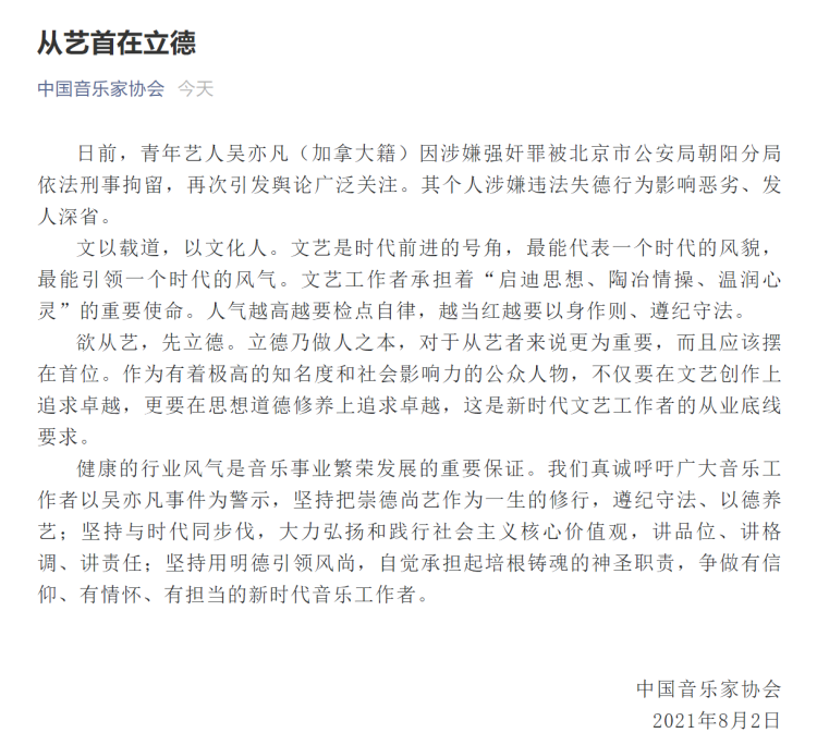 中国音乐家协会声明,欲从艺,先立德。立德乃做人之本,对于从艺者来说更为重要,而且应该摆在首位。作为有着极高的知名度和社会影响力的公众人物,不仅要在文艺创作上追求卓越,更要在思想道德修养上追求卓越,这是新时代文艺工作者的从业底线要求。“我们真诚呼吁广大音乐工作者以吴亦凡事件为警示,坚持把崇德尚艺作为一生的修行,遵纪守法、以德养艺;坚持与时代同步伐,大力弘扬和践行社会主义核心价值观,讲品位、讲格调、讲责任;坚持用明德引领风尚,自觉承担起培根铸魂的神圣职责,争做有信仰、有情怀、有担当的新时代音乐工作者。”