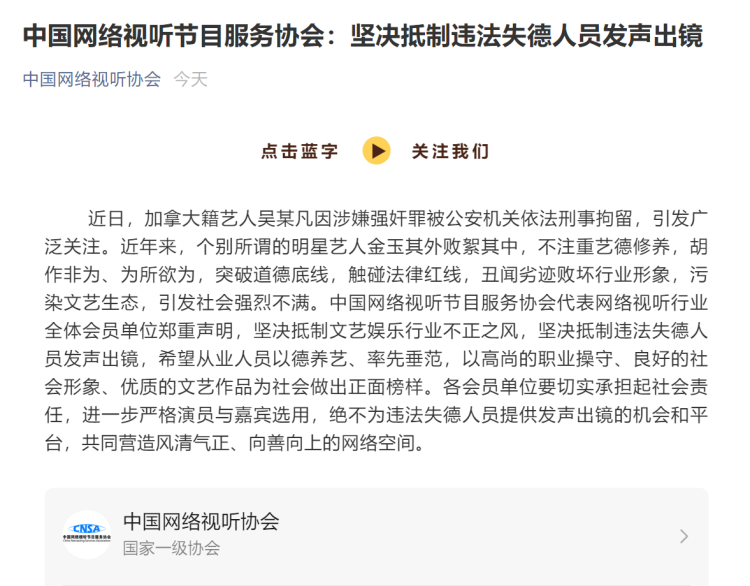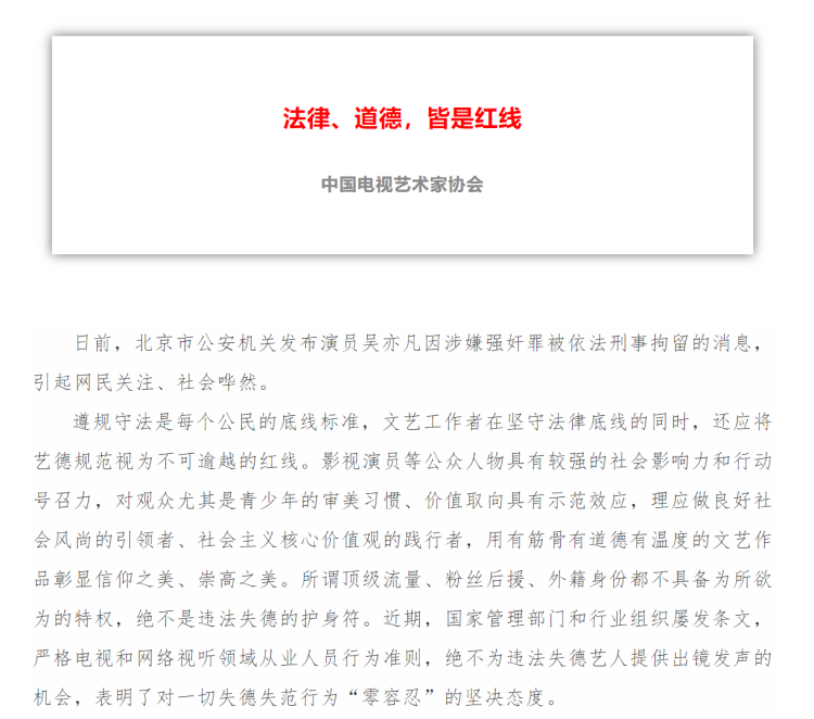 中国网络视听节目服务协会郑重声明,坚决抵制文艺娱乐行业不正之风,坚决抵制违法失德人员发声出镜,希望从业人员以德养艺、率先垂范,以高尚的职业操守、良好的社会形象、优质的文艺作品为社会做出正面榜样。各会员单位要切实承担起社会责任,进一步严格演员与嘉宾选用,绝不为违法失德人员提供发声出镜的机会和平台,共同营造风清气正、向善向上的网络空间。