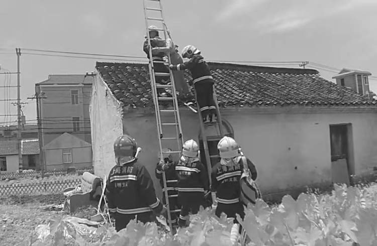 92岁的鲁大爷(化名)平时居住在崇明堡镇儿子家里,前段时间因台风“烟花”侵袭,他放心不下乡下农村里那几间低矮老房子,趁着天气晴好,7月26日中午鲁大爷瞒着家人乘坐公交回到港沿镇老家,在查看老房子过程中,他看到屋檐上方有几片瓦被台风掀翻,随时可能掉落。鲁大爷便从房子里搬出梯子靠上屋檐,慢慢悠悠爬了上去,最后趴上了屋顶。可刚上去,鲁大爷就后悔了,他在屋顶上匍匐着一直不敢站起来,声音也发不出来。