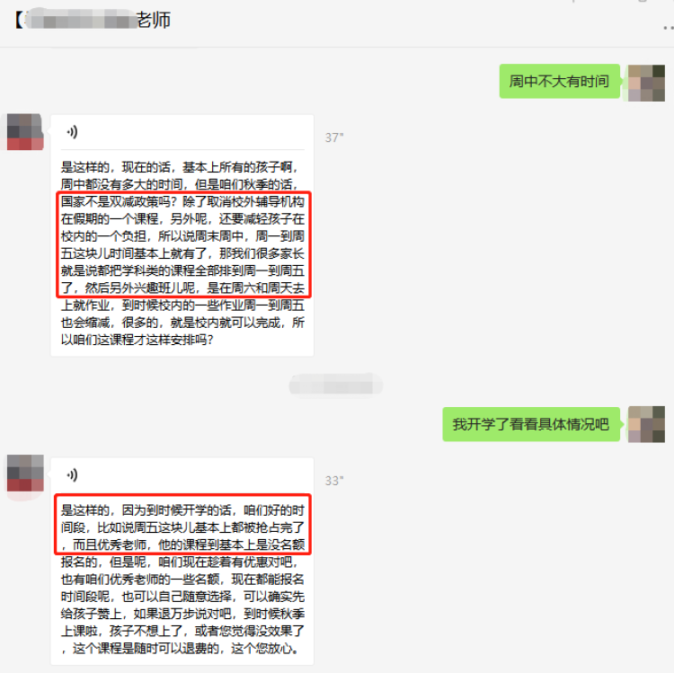 销售劝说家长尽早报名,抢占周五晚时间