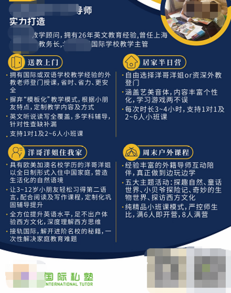 这是一家主打外教授课的机构,服务项目分为送教上门、居家半日营、住家家教与小班周末户外课。