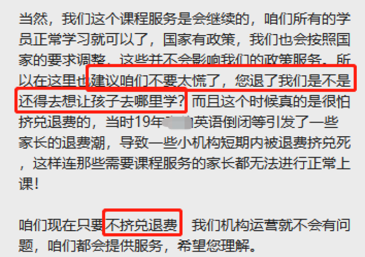 “现在会产生一些挤兑退费的情况,当前机构为了稳定运营,针对于退费情况,公司无奈实施退费缩紧政策,所以如果要退费,会稍微慢一点给家长到账,确实没有办法给到具体的承诺。 ”