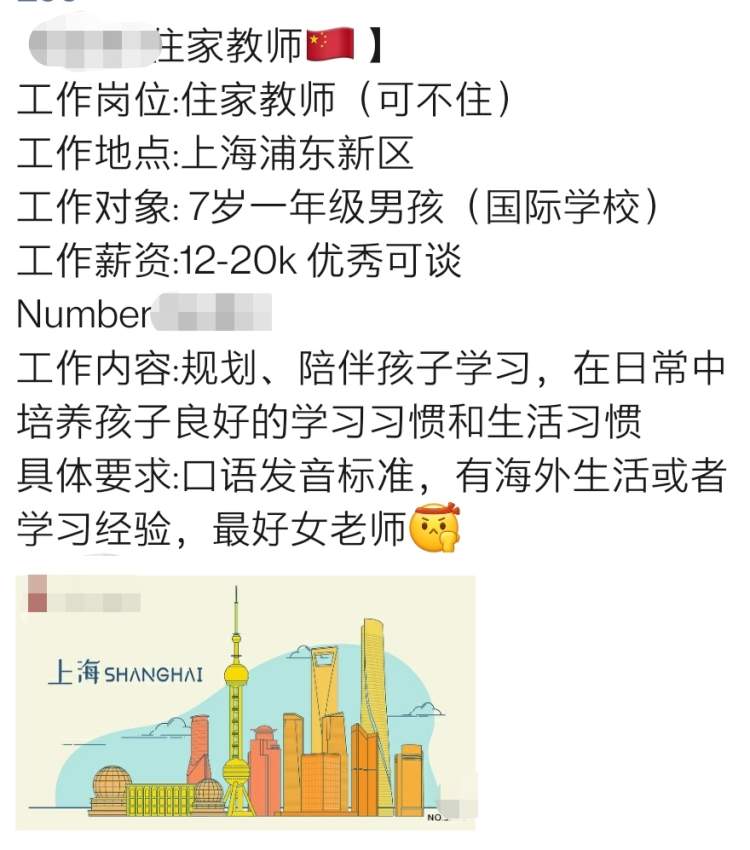 上海家庭给住家教师开出的月薪价位一般都在1.2万-2万之间,而这些家庭属于经济水平较高的群体,有的孩子就读于国际学校,有的除了住家教师还同时学习舞蹈、钢琴、美术等课程,有的家庭甚至不止一位住家服务人员,另为孩子配备了阿姨、司机等。