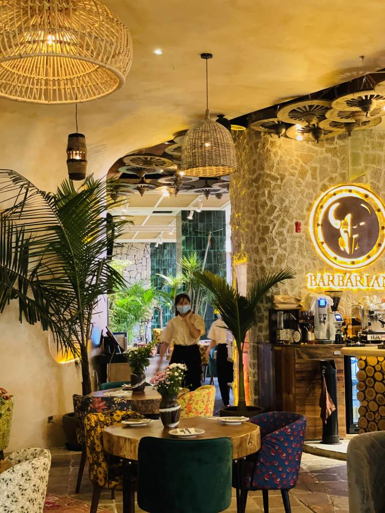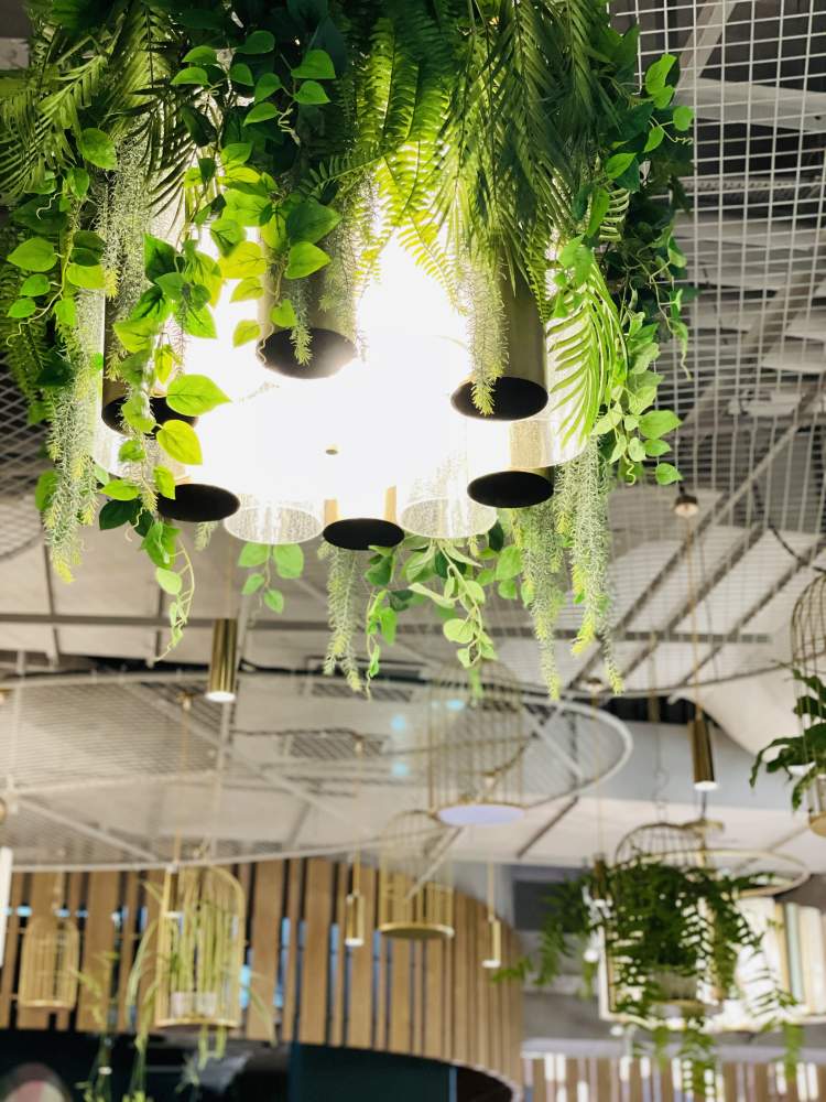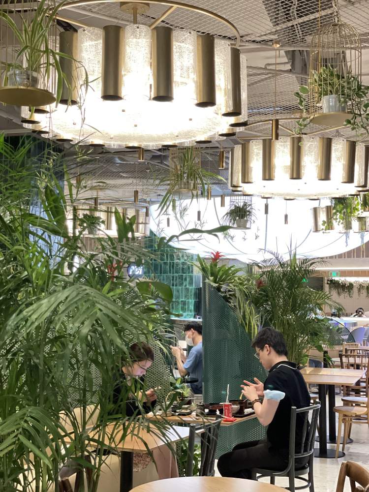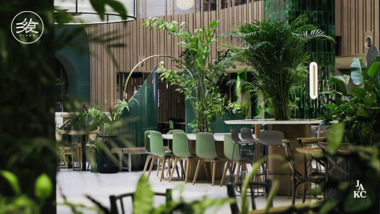 繁茂绿植掩映下的舒适环境,木家具与沙发组带来了惬意享受,并通过自然元素呼应着如山峦般绵延的绿网隔断。公共区域的淡香氛与植物的自然芳香充斥着每处角落,交谈中的人声、舒缓的自然声与食物发出的声音共鸣,令人忍不住就放松下来,沉浸在自然生活的和谐序曲中。