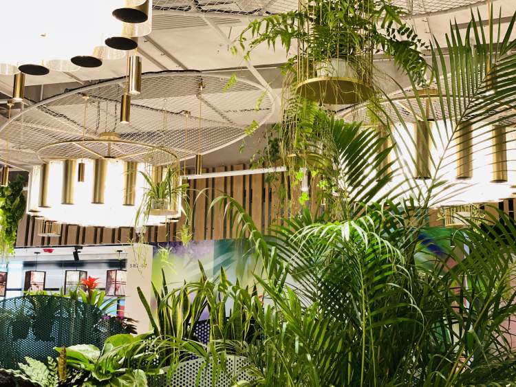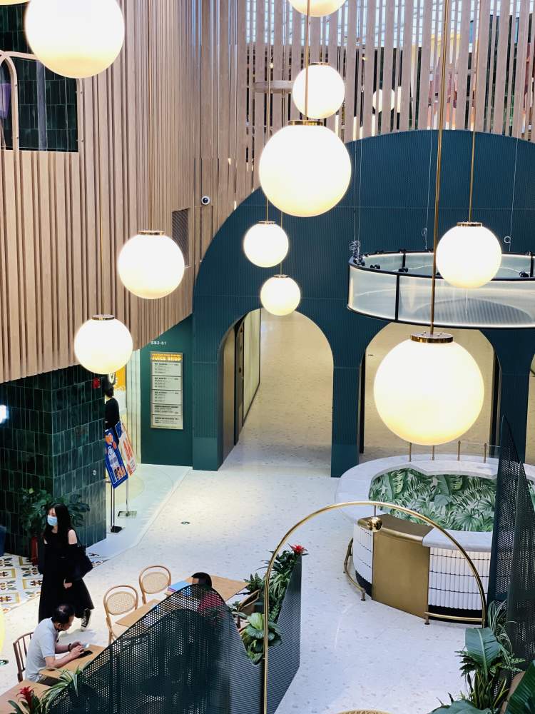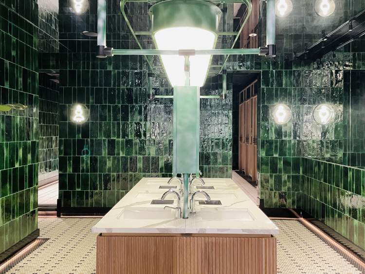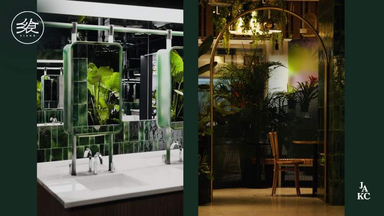 深绿色绿植、深绿色的水龙头、深绿色的墙面,深绿色系给这里的盥洗室带来了一股小清新的邮差风,这个盥洗室也成为了嘉里全新的网红打卡地。更值得一提的是,这里特地设计了男女共用的洗手台,两排相对而置的洗手池,或许抬头的瞬间就有了惊喜,这里有不期而遇的相见。