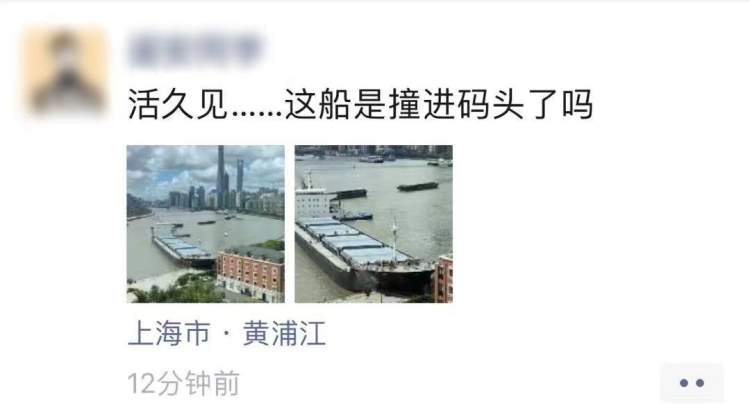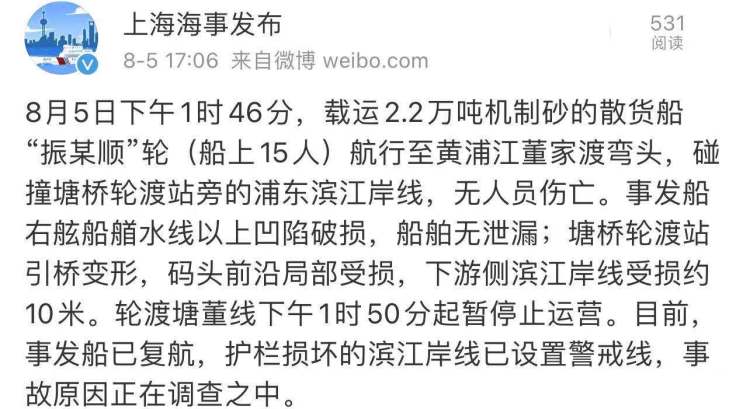 根据上海海事局官方通报,8月5日下午1时46分,载运2.2万吨机制砂的散货船“振某顺”轮(船上15人)航行至黄浦江董家渡弯头,碰撞塘桥轮渡站旁的浦东滨江岸线,无人员伤亡。