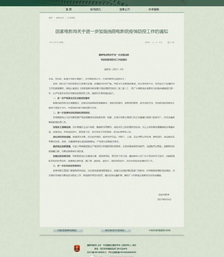 今天,国家电影局发布关于进一步加强当前电影院疫情防控工作的通知。