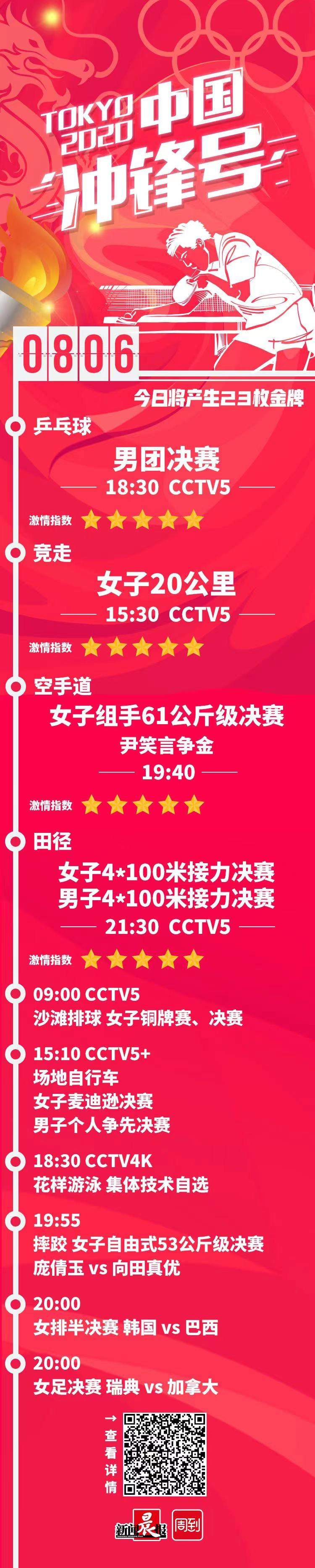8月6日,奥运会赛场将产生23枚金牌。中国军团在乒乓球男团和女子20公里竞走这两个项目上夺金较稳,在男子50公里竞走、女子标枪和空手道等项目需要冲金,男子百米接力则力争拿到奖牌。