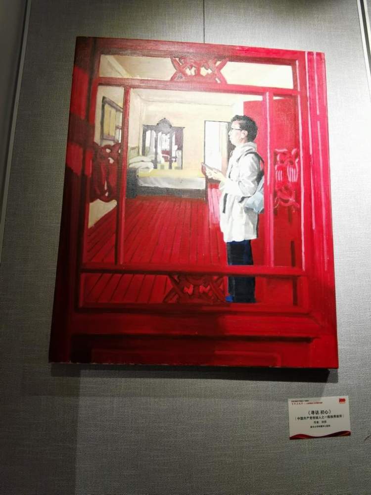 展览上,一幅名为《寻访.初心 陈独秀故居 》的油画作品吸引了不少参观者。画面中红色的窗户里,一位参观者凝神注视着陈独秀故居一角,认真听取讲解,追思这位思想家和革命者的探索与酝酿,也让参观者对于中国共产党的初心有了更深的敬意。