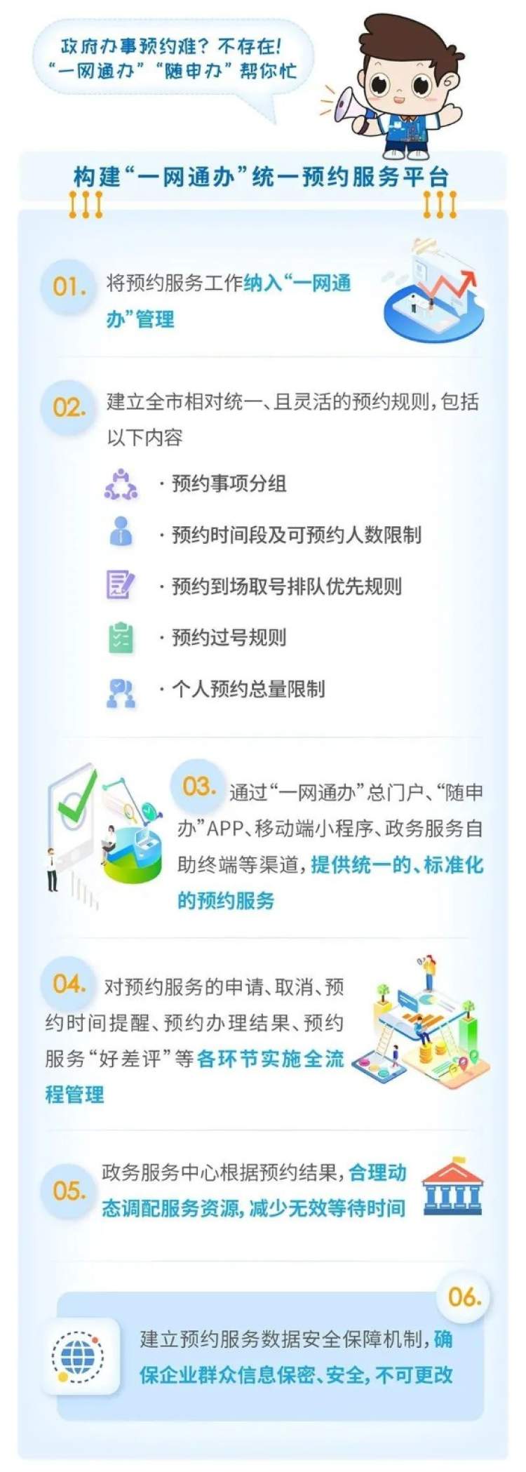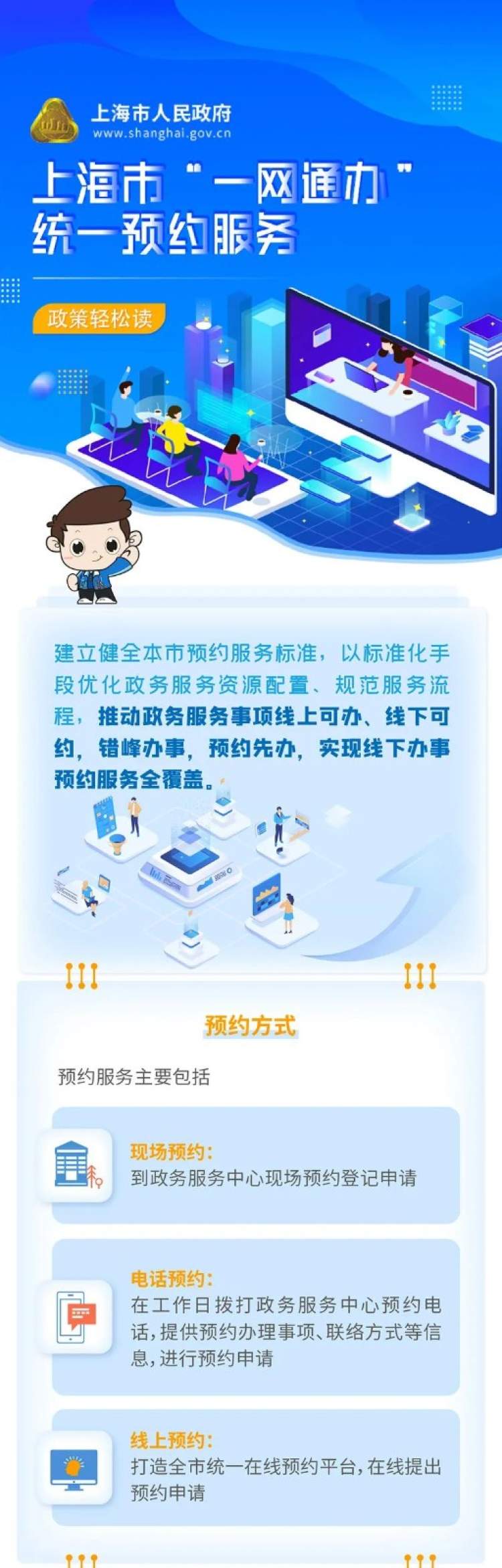 “一网通办”统一预约服务年底全覆盖!预约服务一般事项等候时长不超10分钟 叶松丽 2021-8-06 来源:周到上海 沪构建“一网通办”统一预约服务平台,推动政务服务事项线上可办、线下可约,错峰办事,预约先办,实现线下办事预约服务全覆盖。预约服务主要包括电话预约和线上预约等。到2021年底,基本实现本市统一预约服务全覆盖。预约服务一般事项等候时长不超过10分钟,复杂事项不超过30分钟,特殊情形不得超过60分钟。 来源:周到上海 作者:叶松丽 赞一个 (0)