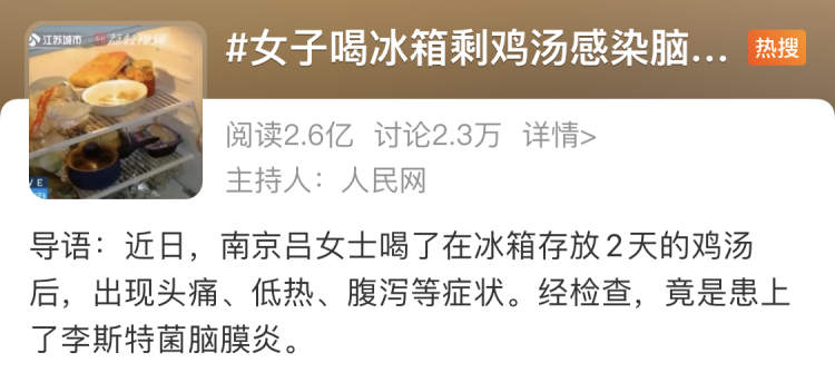 热搜中的那位女士经过诊断就是因食用了冰箱中存放2天的鸡汤后患上了李斯特菌脑膜炎↓↓↓