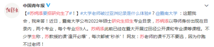 在得知“亚洲飞人”苏神招研究生后,网友立刻展开了热烈的讨论,纷纷对暨南大学的学生表示羡慕嫉妒,得是多好的运气才能成为苏神的学生!