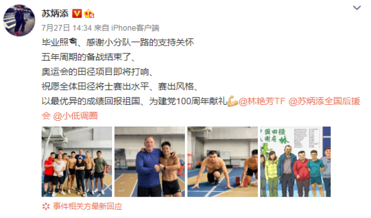不过今年7月27日,苏炳添在微博上已经晒出了毕业照。↓