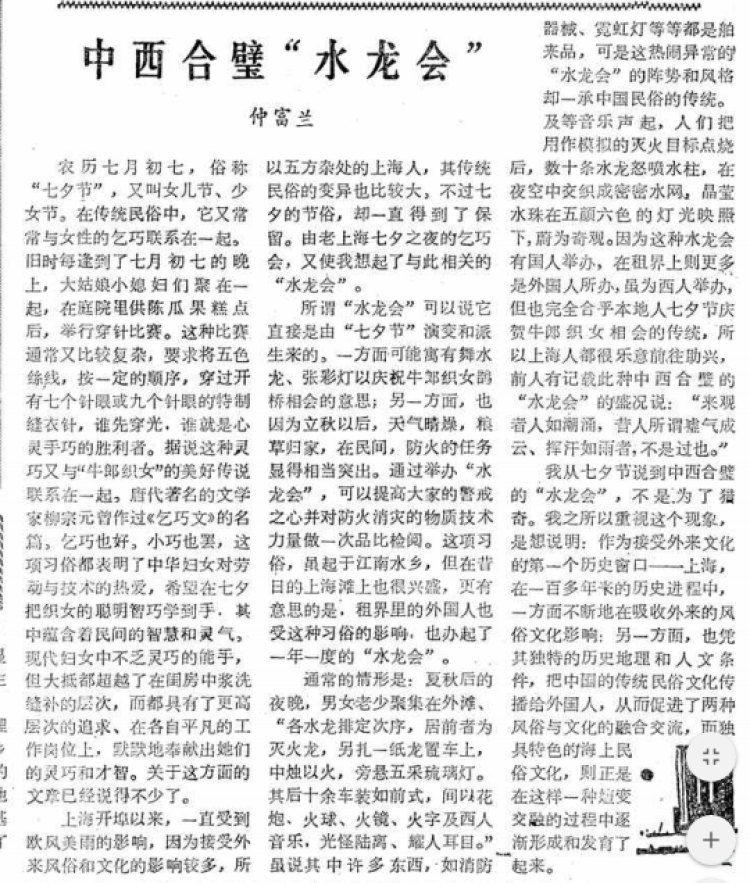 上海市民俗学会会长、华东师范大学教授仲富兰多年来潜心研究中国民俗文化学、民俗传播学,是中国民俗文化学科的开拓者和奠基人。对于七夕,仲富兰从1980年代末期就开始在媒体上撰文发表文章。在1989年9月19日《解放日报》朝花版面中的文章——中西合璧“水龙会”,仲富兰不仅介绍了七夕的由来,还介绍了上海以前在七夕举行的“水龙会”民俗活动。