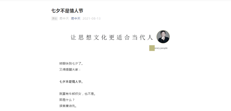 8月13日,易中天官方公众号刊发“七夕不是情人节”