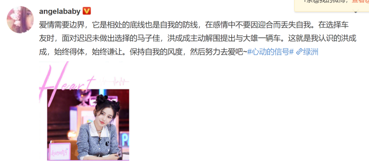 Angelababy日前在社交平台写下对《心动的信号》的感想:“爱情需要边界,它是相处的底线也是自我的防线,在感情中不要因迎合而丢失自我。”进而谈到节目中一直没能做出决定的马子佳被洪成成主动解围,一直都很留意洪成成的她忍不住称赞:“始终得体,始终谦让,保持自我的风度,然后努力去爱吧~”