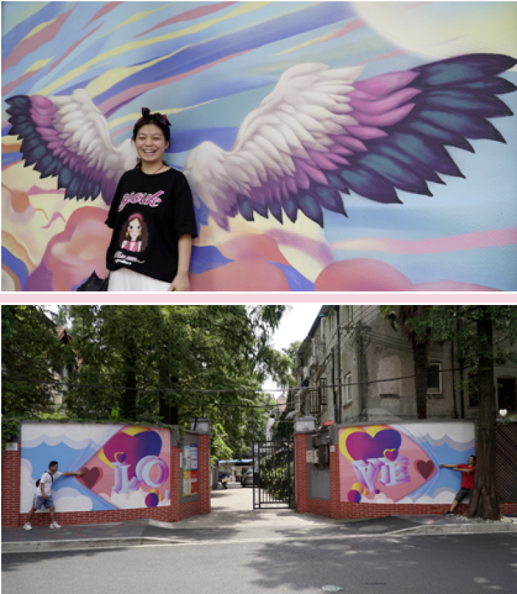 “留言墙”旁还有创意极佳的艺术墙绘——无论是站在“翅膀”前摆上“天使”的造型,或是情侣一同上场“揭开爱情的大幕”,都是不错的互动体验。