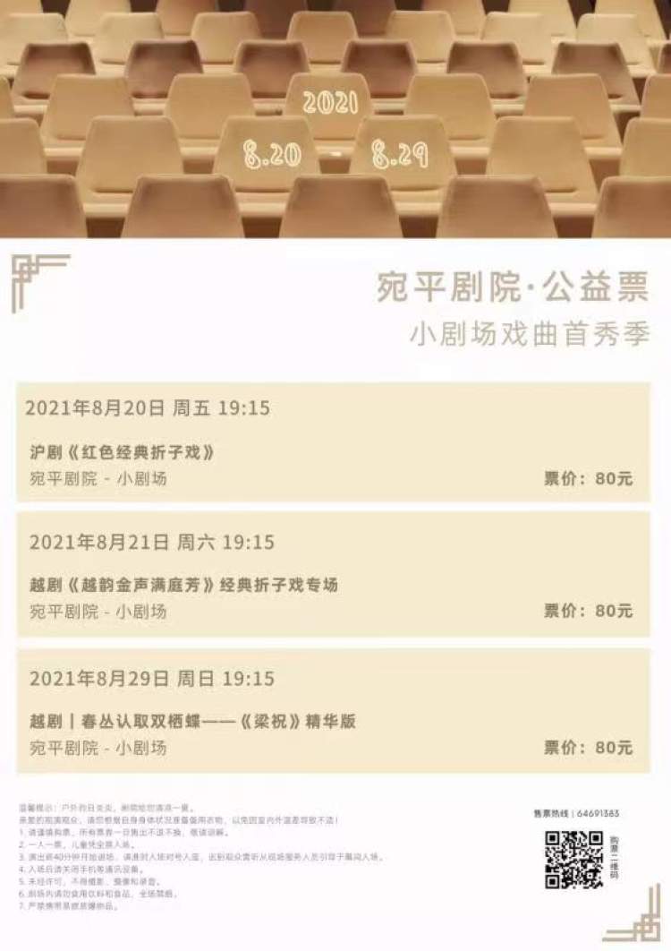 此次公益季演出一共有三场,分别为8月20日的沪剧《红色经典折子戏》、8月21日的越剧《越韵金声满庭芳》以及8月29日的越剧《春丛认取双栖蝶》。三场演出均为全场公益价80元,用如此优惠的价格便可在观赏经典戏曲的同时参观打卡宛平剧院的扇形旋转楼梯、巨型扇骨窗等,并且能在小剧场静谧且深邃的环境内感受一场沉浸式演出,这是不可多得的好机会。