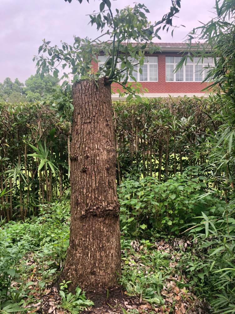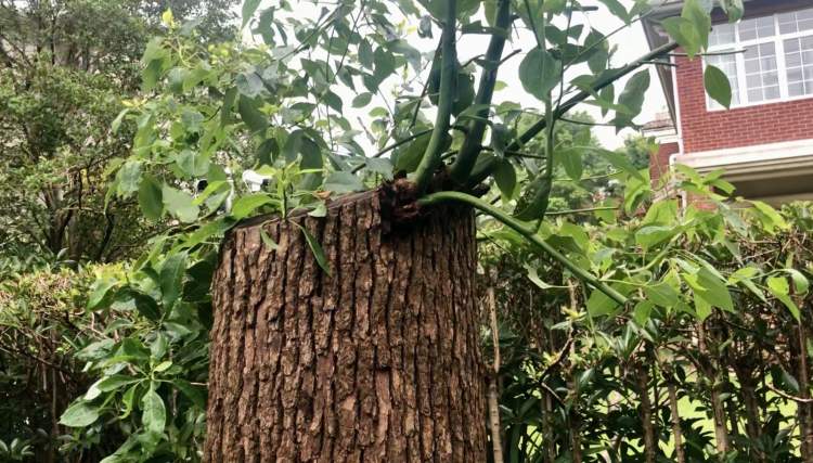 记者在绿洲比华丽花园看到,李先生“修剪”过后的香樟树高约2米,树干直径约30公分,能够清晰地看到被砍断的横截面,在横截面的一旁,冒出了数根约半米长的嫩枝,其上长了不少绿叶。