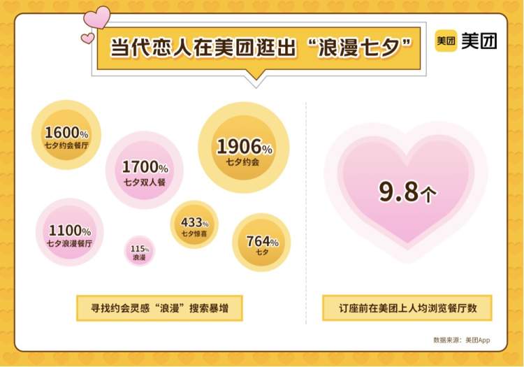 美团App最新搜索和订座等相关数据显示:鲜花搜索量过去一周上涨159%,使用“订座”功能预订七夕当日餐厅不仅超过2月14日,而且同比去年七夕增长近一倍,上海领衔全国。