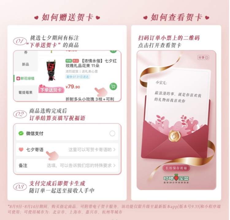 今年叮咚买菜上的“七夕”爆款,依然还是代表着爱情、浪漫的红色玫瑰。而在平时,10枝粉色玫瑰也是最受欢迎的单品之一。叮咚买菜还首次采用了“电子贺卡”的形式,上海顾客购买七夕鲜花,下单填写表白/祝福语,就能用环保且更加“互联网”的方式,传达祝福。