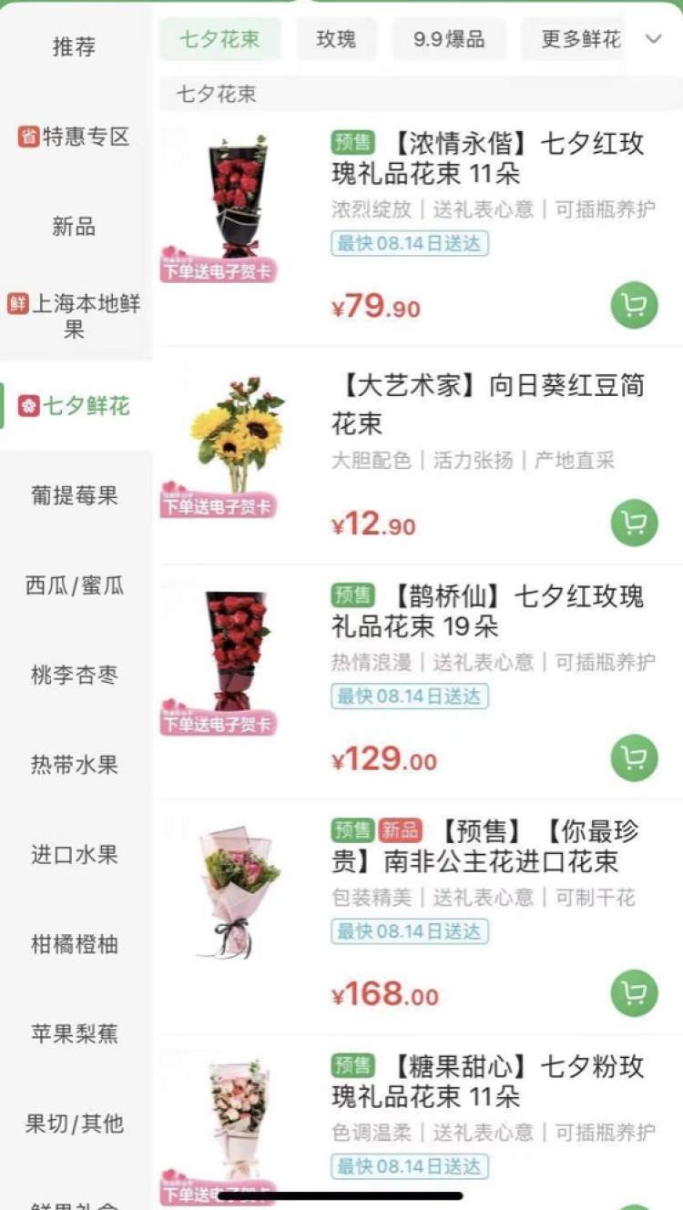 叮咚买菜数据显示,截至目前,七夕礼品花束预定量相比今年“520”实现了翻倍,整体销量预计环比增长50%以上。《2021盒马七夕鲜花消费报告》更是发布了多项有趣的七夕鲜花大数据。