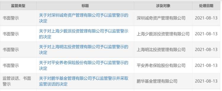 8月13日晚间,上交所官网披露5份监管警示函,打击网下投资者报价违规:对1家公募基金公司(鹏华)采取监管谈话并采取书面警示监管措施,对1家保险公司(平安养老保险),3家私募(深圳诚奇资产、上海少薮派投资、上海明汯)采取书面警示监管措施。公开资料显示,这3家私募均为百亿级私募。