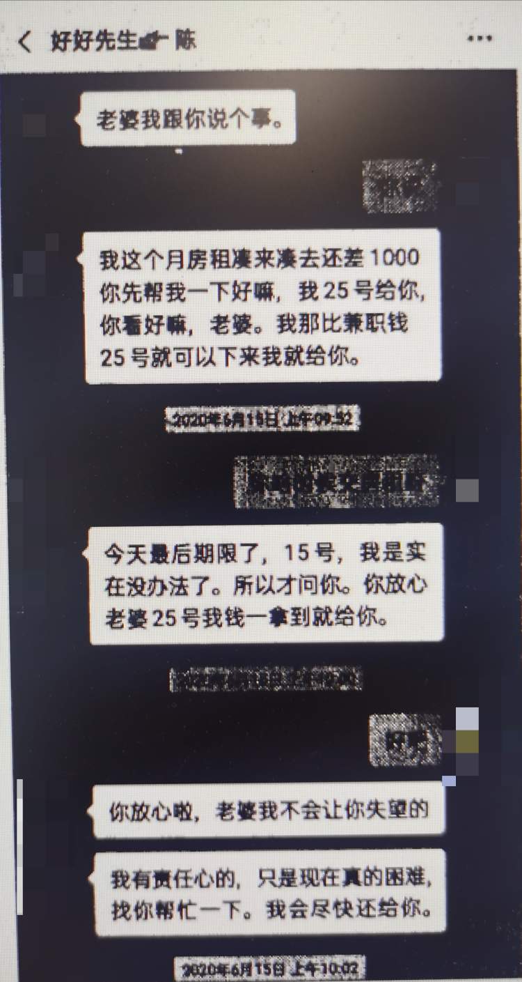2019年3月,男友陈少国声称自己欠了房租,问沈女士借1500元,沈女士二话不说直接转账,没过几天,男友就把钱如数还给了沈女士。
