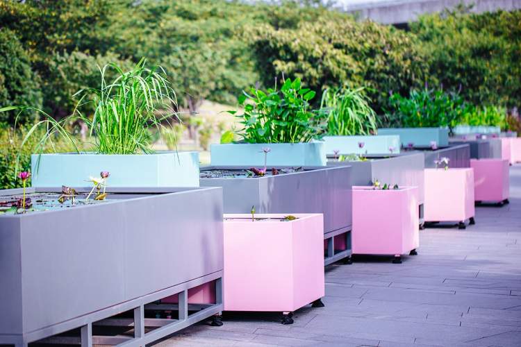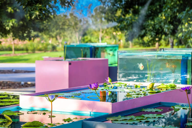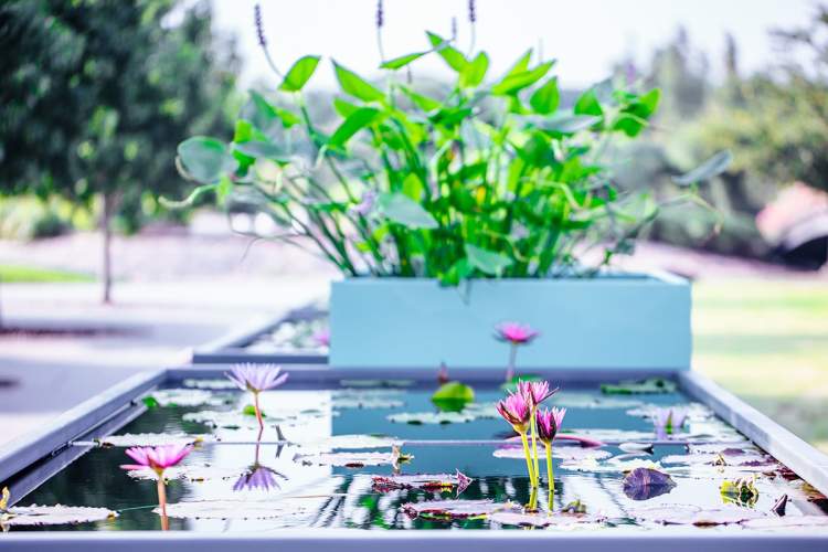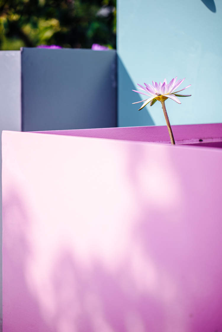 在1号门内广场,除了抢眼的红色系睡莲,睡莲的布展容器也很特别。辰山植物园秉承可持续发展的原则,循环利用了过去花展的容器,通过旧物改造,让容器继续发挥余热。同时,以“旧容器新组合”的形式,通过色彩变化和观赏鱼的互动,让睡莲展给游客带来全新体验。