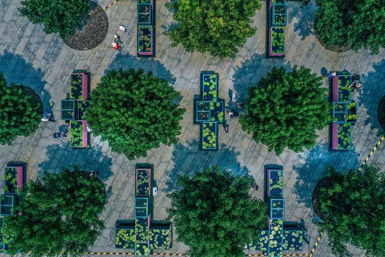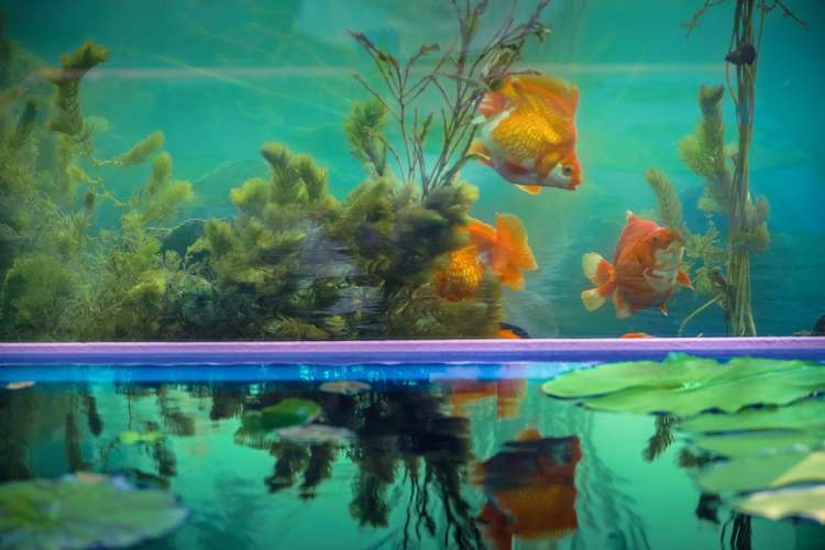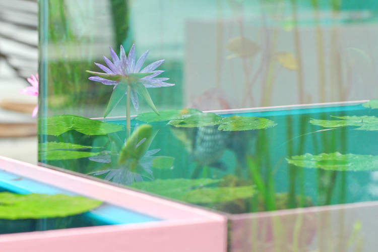 缸体中清澈的水面倒映着天空,花影、鱼影虚虚实实相互交叠,睡莲与鱼无声互动,平添了一份意境,较往年更具科普性、趣味性与观赏性。同时,鱼缸内部的空间为眼子菜、苦草、金鱼藻等沉水植物以及萍蓬草的根茎提供了展示空间。