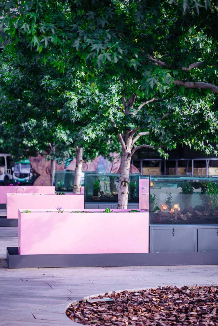 在箱体色彩选择上,樱粉、玉青与静谧灰组合,清新而充满活力。清透的鱼缸穿插于氤氲的水雾间,花影间“人静鱼自跃”,在静谧的氛围中透出一股活力。