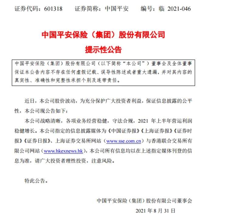 8月31日午间中国平安公告:公司近日股价波动。为充分保护广大投资者利益,保证信息披露的公平性,公告如下:公司战略清晰,各项业务经营稳健,守法合规,2021年上半年营运利润稳健增长。午后其股价跌幅收窄。