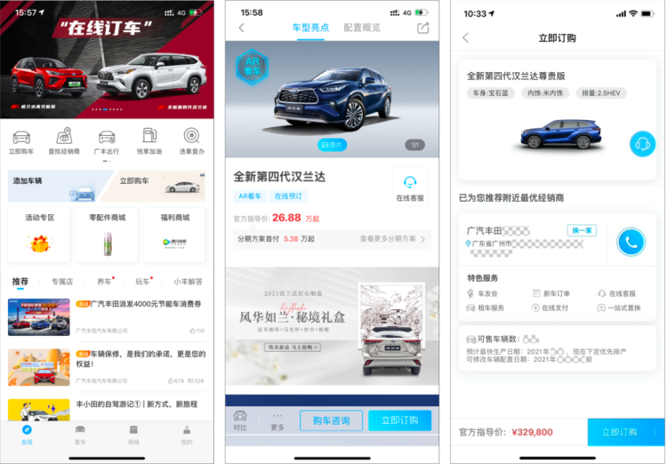线上下订-便捷:用户登录丰云行APP,点击“立即订购”进入页面,选择车型版本、车身色、内饰色等信息,即可查看各经销商可售车辆数和预计生产日期。