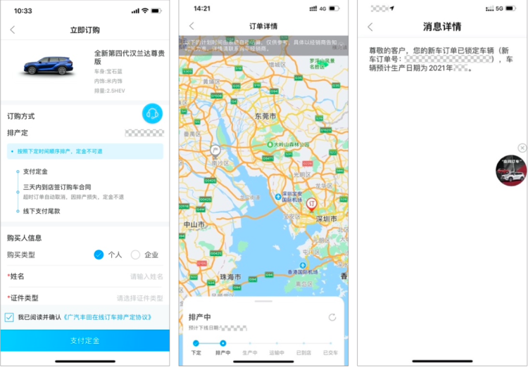 交期明确-透明:用户可在丰云行APP上查看新车进程,“下订、排产、生产、运输、到店、交车”各节点,丰云行APP都会给用户发送提醒,做到新车交付心中有数。