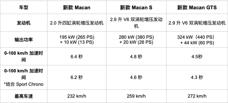 新款 Macan由原来四款动力级别精简为三款。其中,Macan基础款车型搭载了全新的 2.0 升四缸涡轮增压发动机。Macan S 和 Macan GTS 升级为新的 2.9 升 V6 双涡轮增压发动机。三款动力均有提升,依然配备的是 7 速保时捷双离合传动系统(PDK system)与保时捷牵引力管理系统(PTM)的四轮驱动系统。