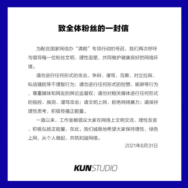 信中呼吁粉丝文明、理智追星,共同维护健康良好的网络环境。工作室表示,请勿进行“任何形式的攻击、争辩、谩骂、互撕、对立拉踩、私信骚扰等不理智行为行为;尊重媒体和网友的舆论监督权;请勿对媒体进行“指控、揣测、谩骂攻击”,粉丝文明上网,拒绝网络暴力;保持理性思考,积极传播正能量。